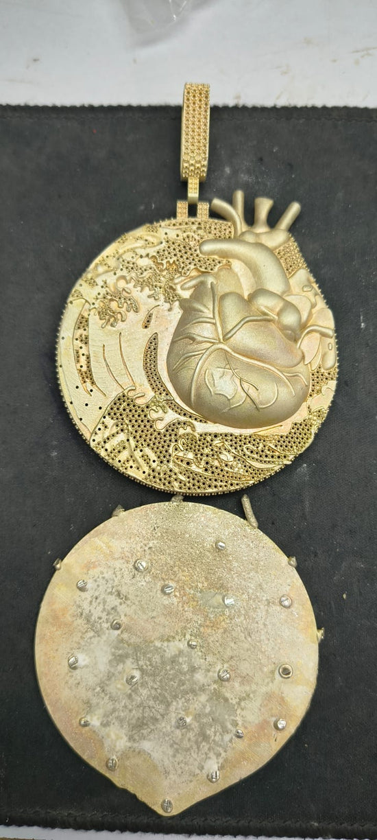 The wax model is a crucial stage in bringing this pendant to life. It transforms the CAD design into a tangible form, showcasing the intricate heart details and surrounding artistic elements with precision. This step ensures that every curve, texture, and proportion is reviewed before casting. The wax model not only confirms structural accuracy but also provides a physical preview for final adjustments, guaranteeing the finished piece will reflect the client’s vision with perfection.