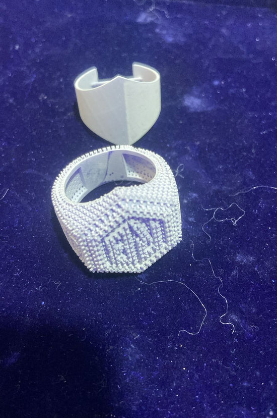We used the lost-wax casting method to bring the digital design to life. The molten took shape with precision, forming the base of the ring. Once cooled, the piece was cleaned, refined, and perfectly balanced to match the original concept. After shaping, artisans carefully began the stone-setting process manually placing each sparkling stone to achieve a full iced-out look that radiates from every angle. This is where the ring truly came alive, turning imagination into reality.