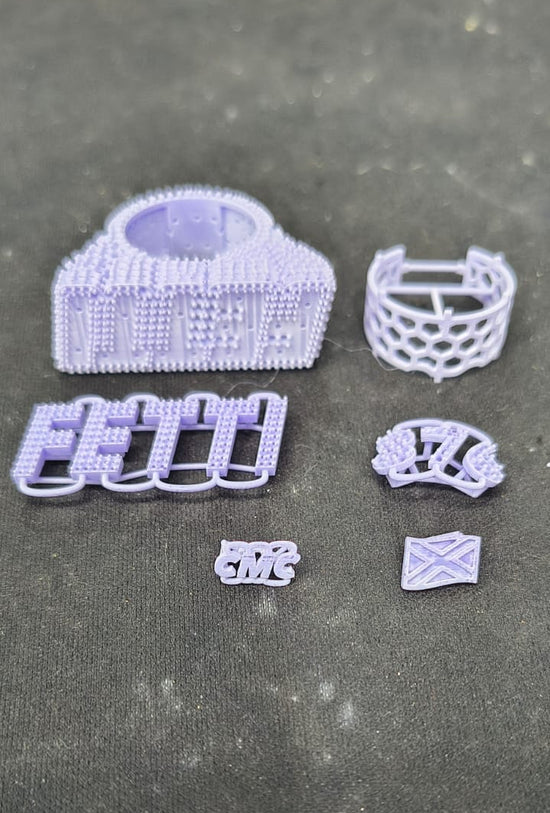 This image showcases detailed wax models created through CAD design and 3D printing for a fully customized diamond ring. Each part of the design is visible in wax form including the bold FETTI lettering, honeycomb-style shank, and intricate side elements. These wax prototypes represent the exact structure where diamonds will be set, allowing clients to visualize the masterpiece before casting it in precious metal.