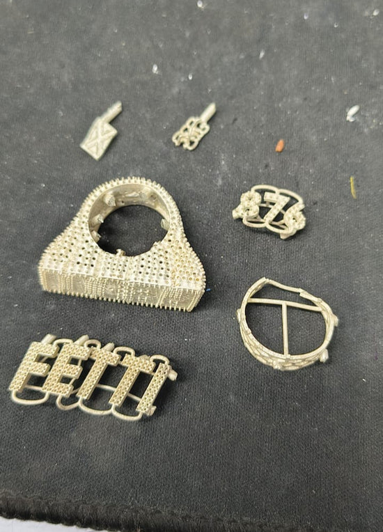 This image shows the raw casting parts of the custom FETTI ring before assembly and polishing. Each element, including the bold “FETTI” lettering, intricate side designs, and the base ring structure, has been cast in metal with precise detailing. These pieces will later be assembled, set with diamonds, and polished to create the final luxurious masterpiece.