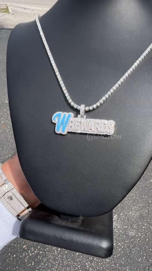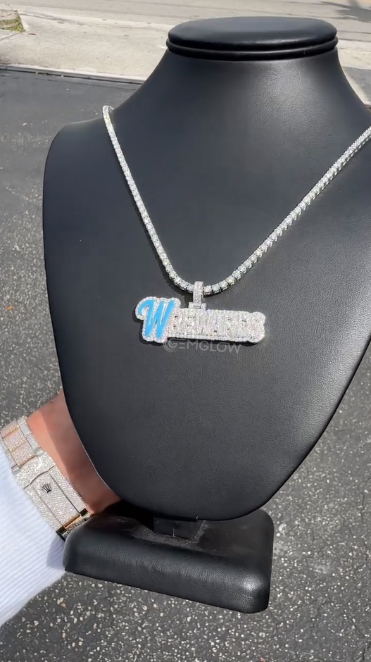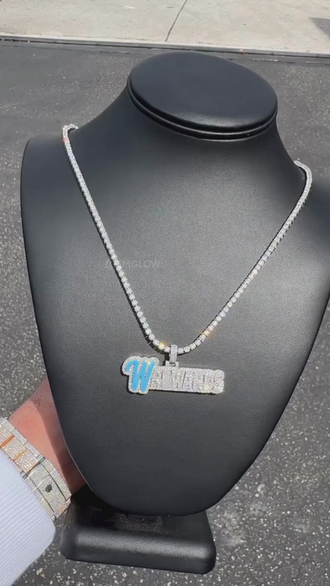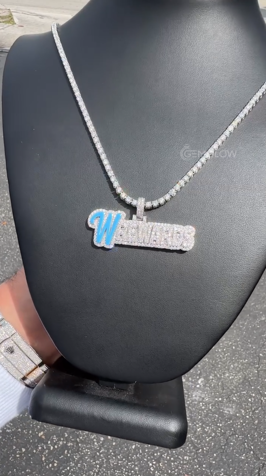 Iced out round cut moissanite tennis chain with pendant. Unisex hip hop jewelry, bold rapper style, perfect birthday gift for him or her.