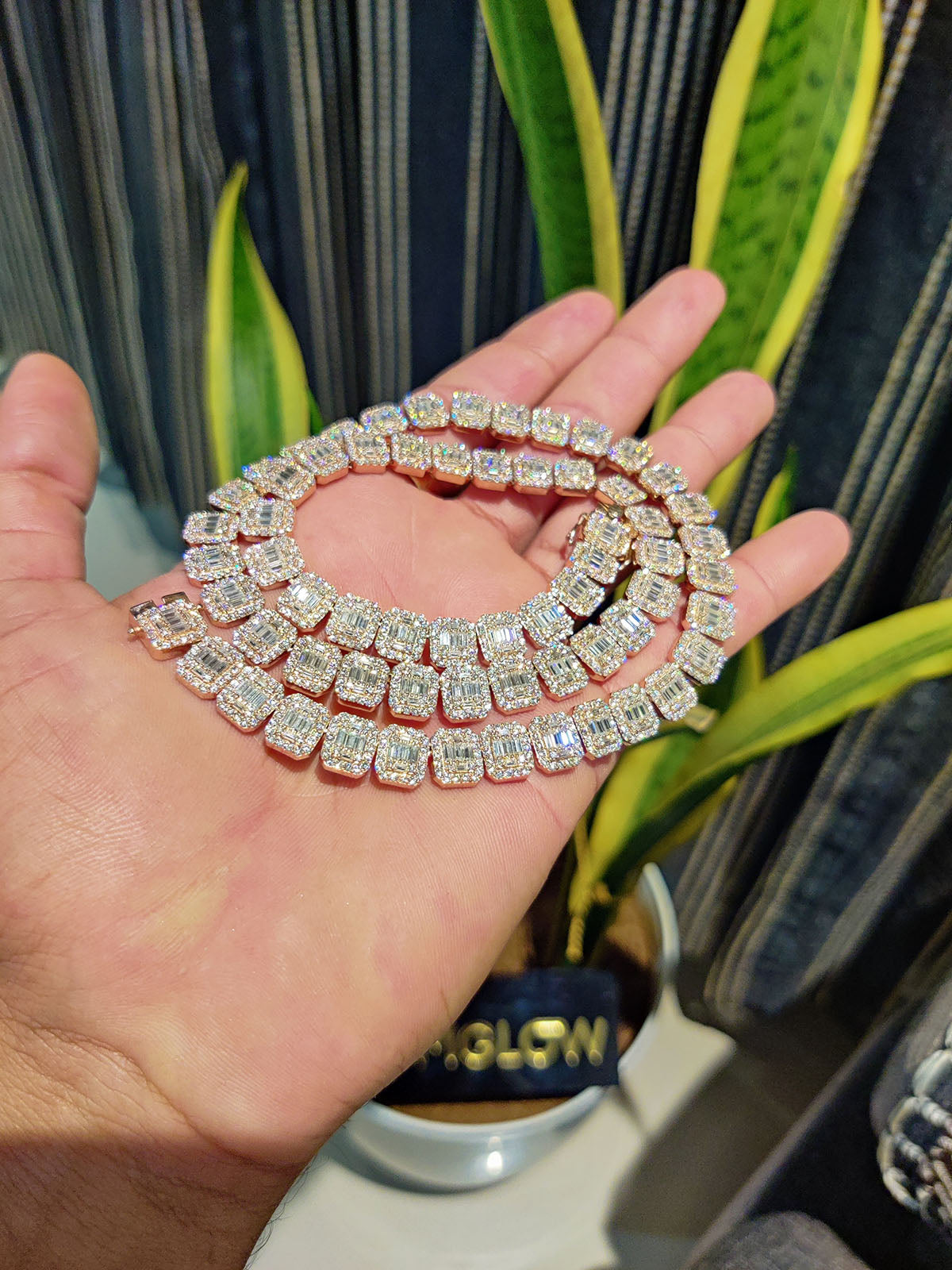 10MM iced out moissanite chain with round & baguette stones in rose gold. Bold hip hop statement necklace for men & women. Great gift for any occasion.