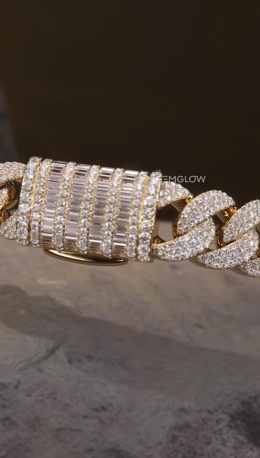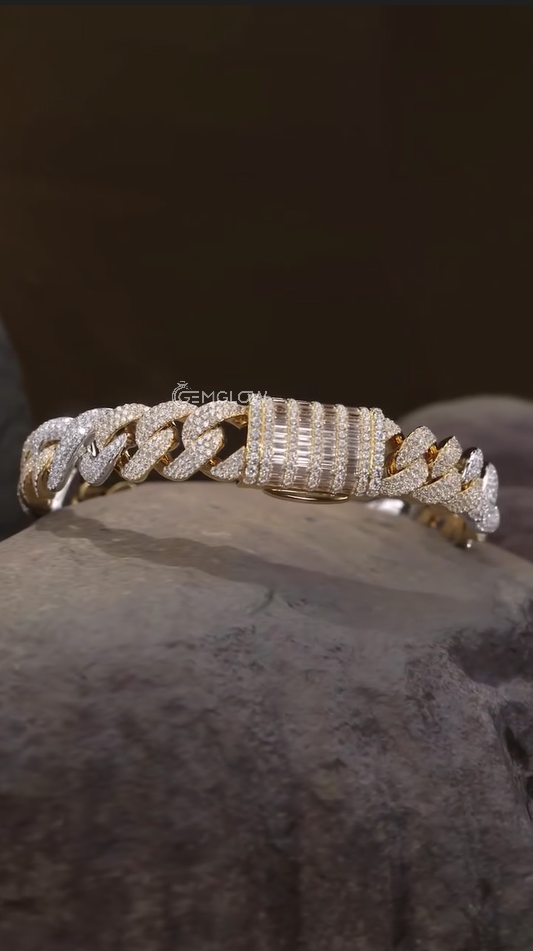 Moissanite Round And Baguette Diamond Bracelet, Luxury Hip Hop Jewelry for Men, Hip Hop Bracelet, Yellow Gold Diamond Bracelet, Baguette Lock Bracelet, Full Iced Out Bling Bracelet, Miami Cuban Bracelet