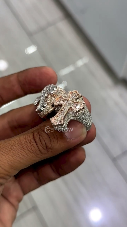 Iced Out Cross Ring for Men, 925 Silver Baguette & Round Moissanite Diamond, Custom Luxury Jewelry, Unisex VVS Moissanite Baguette Cross Ring for her, Baguette Cross Ring for him, White Gold or Yellow Gold Plating, Hip Hop Bling Statement Ring, Custom Luxury Jewelry