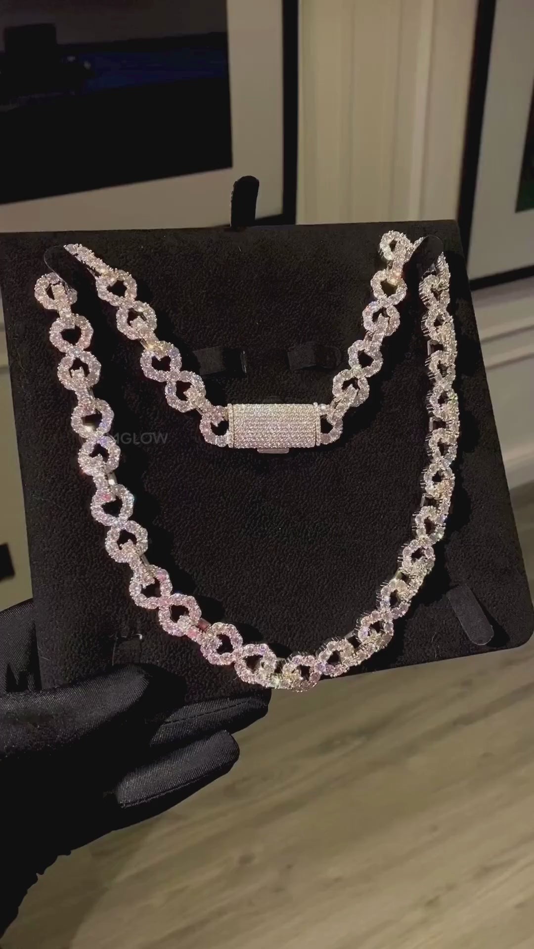 White gold plated moissanite infinity Cuban chain. Luxury hip hop jewelry for men & women, bold rapper style, perfect party wear or birthday gift.