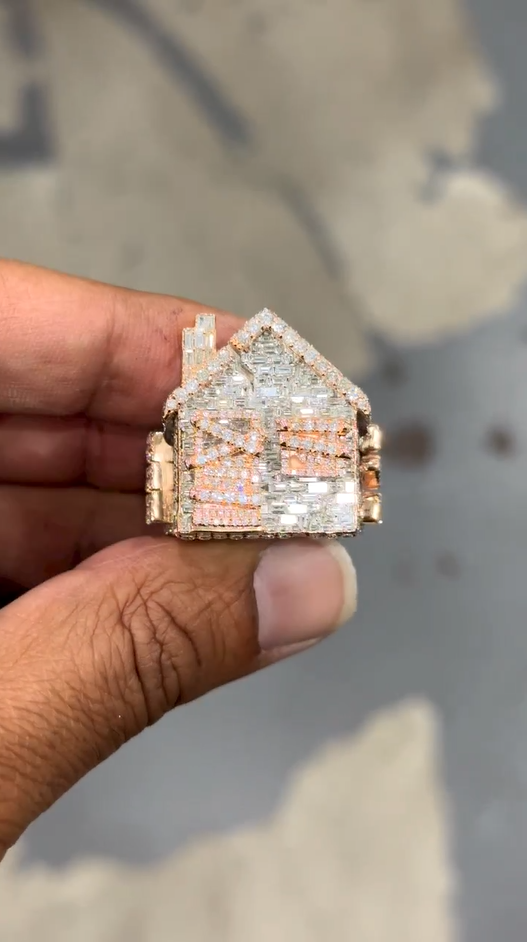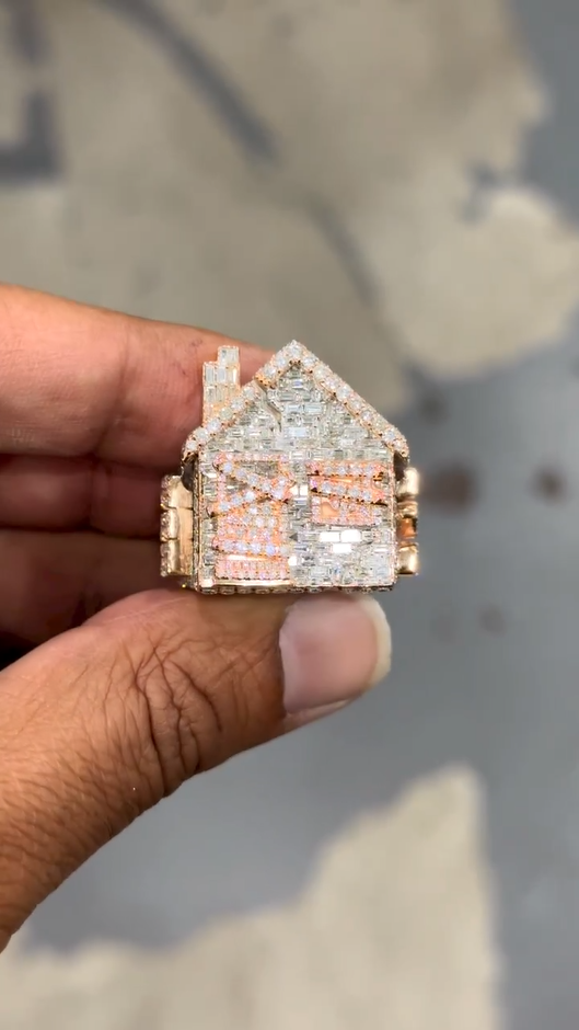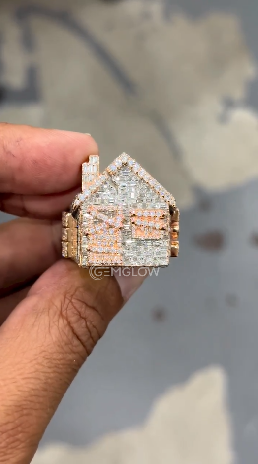 Fully iced out Trap House ring with VVS round & baguette moissanite diamonds, 925 silver hip hop jewelry for men, bold rapper bling statement piece