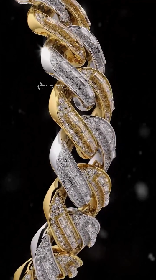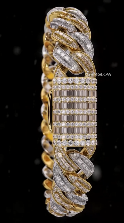 14MM Two Tone Iced Out Yellow and White Gold Diamond Bracelet Hip Hop Moissanite Bracelet For Him, Round and Baguette cut Diamond Rapper Fashion Gift